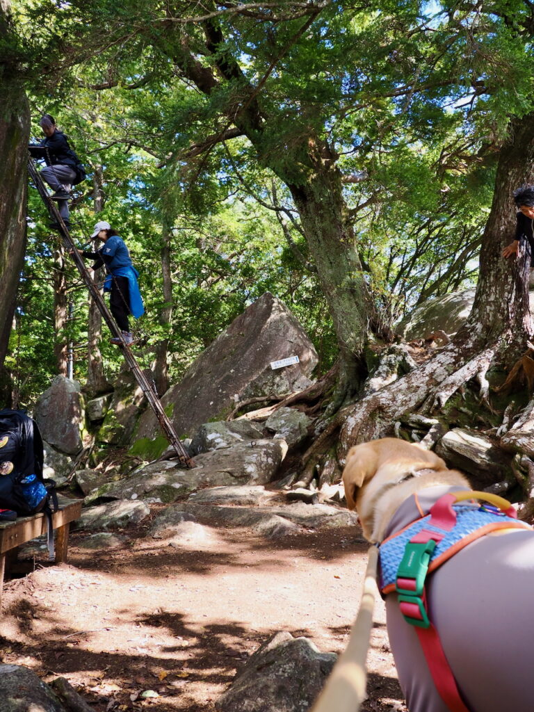 天狗倉山山頂は大岩の上にあるため、梯子で登ります。飼い主さんが行ってくる間、わんちゃんは下で待っていてもらいます。